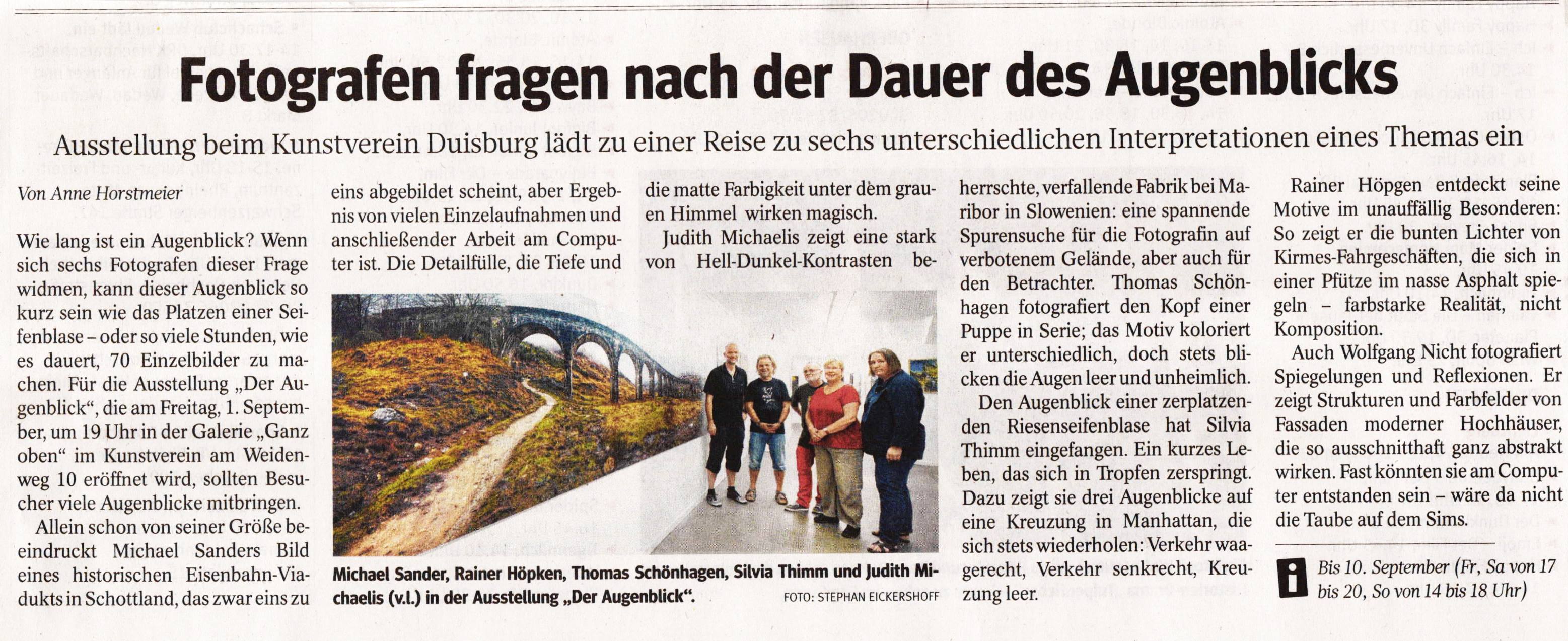Wie lang ist ein Augenblick? Wenn sich sechs Fotografen dieser Frage widmen, kann dieser Augenblick so kurz sein wie das Platzen einer Seifenblase - oder so viele Stunden, wie es dauert, 70 Einzelbilder zu machen. Für die Ausstellung ,,Der Augenblick", die am Freitag, 1. September, um 19 Uhr in der Galerie,,Ganz oben" im Kunstverein am Weidenweg 10 eröffnet wird, sollten Besucher viele Augenblicke mitbringen. Allein schon von seiner Größe beeindruckt Michael Sanders Bild eines historischen Eisenbahn-Viadukts in Schottland, das zwar eins zu eins abgebildet scheint, aber Ergebnis von vielen Einzelaufnahmen und anschließender Arbeit am Computer ist. Die Detailfülle, die Tiefe und die matte Farbigkeit unter dem grauen Himmel wirken magisch. ..." Anne Horstmeier, WAZ Duisburg - Kultur, Mittwoch 30.08.2017